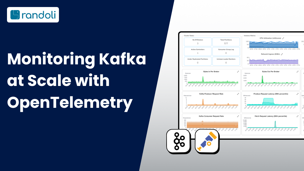 Randoli is built on top of this OTel-native pipeline, with additional configuration that goes beyond what standard JMX exposes. The result is a unified Kafka dashboard that surfaces what actually matters i.e. cluster status, broker performance, consumer lag, latency at the 99th percentile, and PV utilization, all in one view, drillable down to the individual broker or consumer instance level.