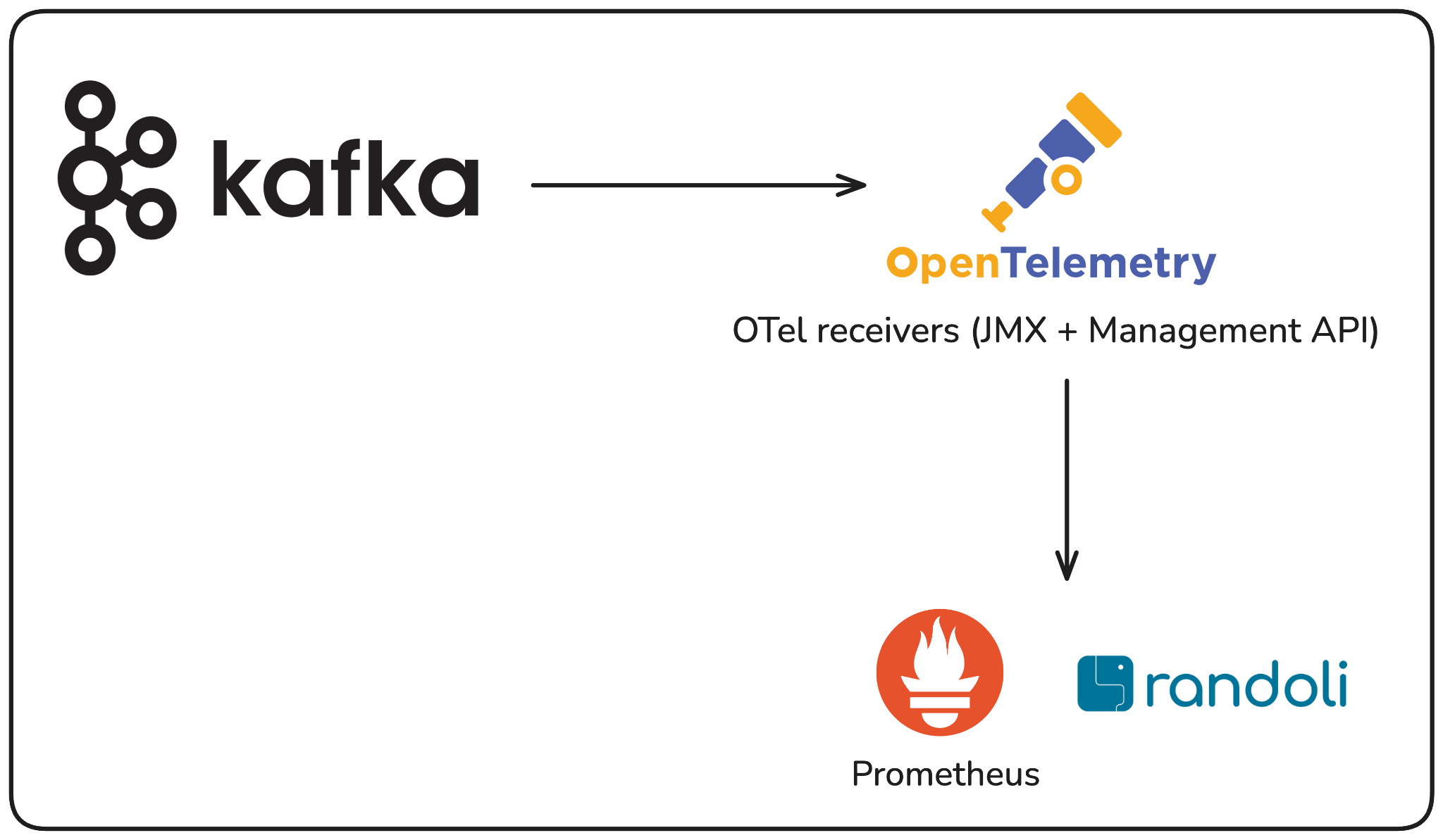 OpenTelemetry changes the collection architecture in a meaningful way. Instead of a JMX agent scraping metrics directly into Prometheus, you build an OTel collector pipeline that pulls from two sources simultaneously: the JMX metric scraper which gives you a way to query JMX metrics and export them via OTLP (OpenTelemetry vendor-neutral protocol). This can be used for per-broker metrics like request latency, log flush time, and JVM heap usage. Second is the Kafka Metrics receiver for cluster-wide signals like active controller count, under-replicated partitions, and consumer group lag across all topics.