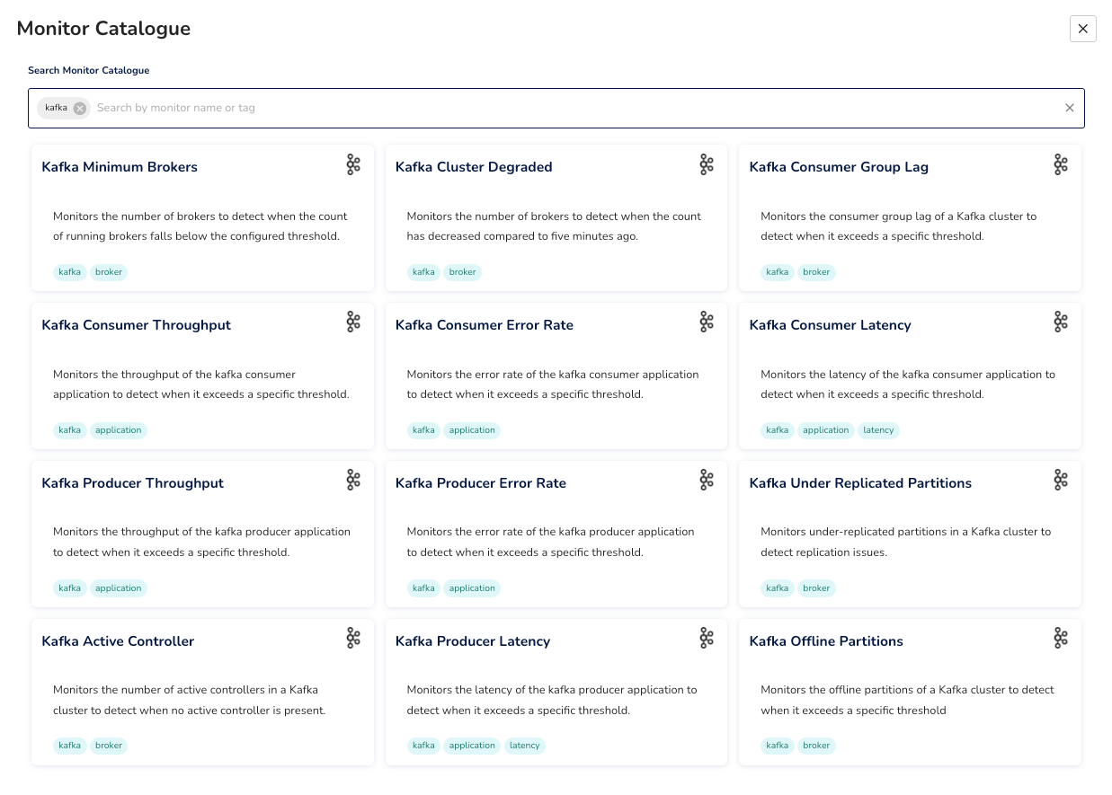 Randoli provides a built-in monitor catalog for Kafka that covers these scenarios out of the box, so you're not starting from scratch. You can configure thresholds to match your requirements, and write custom monitors on top of any metric in the OTel pipeline when your setup needs something more specific.
