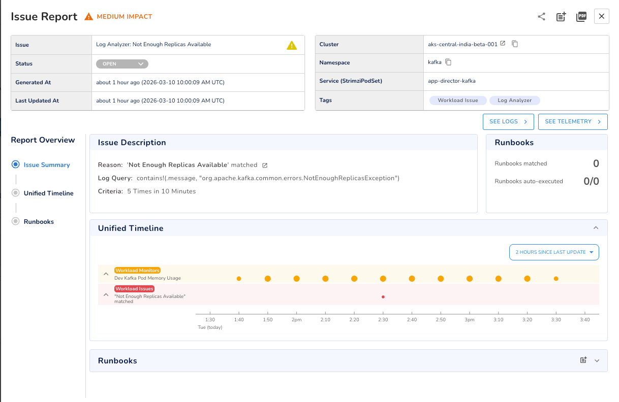 In production, Kafka broker logs contain early warning signals: replication exceptions, ISR warnings, controller errors, that appear long before they surface as metric spikes. By the time the metric moves, the window to act proactively has already closed.