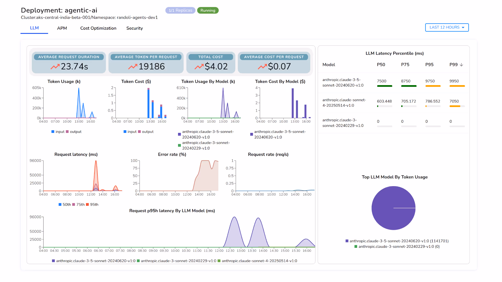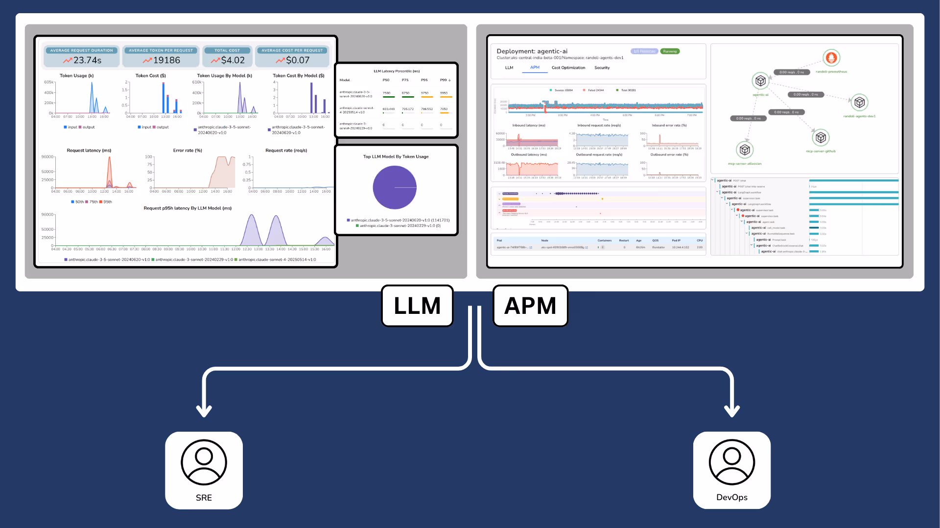Monitor LLM behavior and application performance in a single, correlated view.